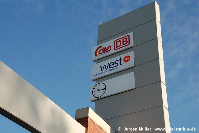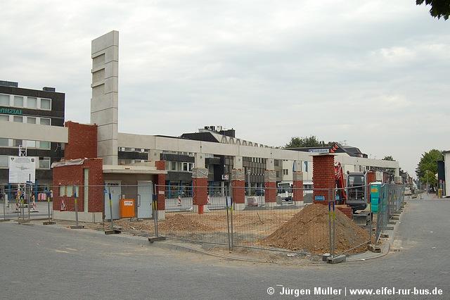 Ankommende und einsetzende Fahrzeuge mussten eine Wendefahrt auf der anderen Seite des Bahnhofs durchführen, um anschließend wieder ordnungsgemäß durch die Einbahnstraße fahren zu können. Ende März 2006 wurde die neu errichtete Haltestellen-Plattform erstmals in Betrieb genommen. Während die Busse vorerst wieder an der Anlage abfahren konnten, gingen die Bauarbeiten rund um die Bahnsteige und den Bahnhofsvorplatz weiter. Im August wurde dann mit der abschließenden Bauphase begonnen. Hierzu wurden die Busse entgegen der eigentlichen Fahrtrichtung an der Haltestellenanlage vorbeigeleitet, während dort Überdachungen und neue Haltestellenschilder montiert wurden. Am letzten Oktoberwochenende wurde der neue Bahnhof beim Stadtfest offiziell eingeweiht und der Bevölkerung vorgestellt. Einen besonderen Blickfang bietet der Turm, an dem neben einer Uhr auch die Logos der Verbundpartner (WestEnergie und Verkehr GmbH und Deutsche Bahn) sowie des Aachener Verkehrsverbundes (AVV) angebracht sind. Bei Dunkelheit erstrahlt ein blauer Lichtstrahl über die gesamte Breite des Bauwerks.