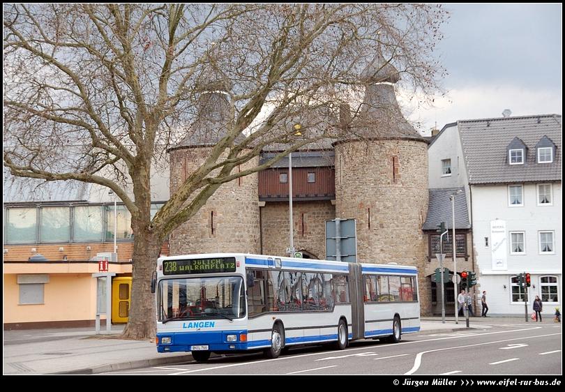 Das "zweite Leben" führte drei Fahrzeuge der ASEAG Anfang 2011 zu Lövenich-Reisen (Langen). Mit DN-L 766 wurde am 12.02.2011 einer der drei MAN NG 262 in neuem Farbkleid vor dem Hexenturm am Walramplatz in Jülich angetroffen.