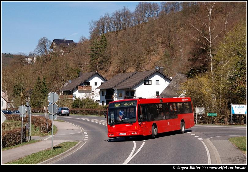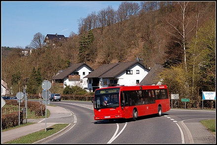 Über ein Jahrzehnt lang haben die DenOudsten B96 der BVR (heute RVE) optisch und vor allem akustisch Abwechslung in die euregionale Busszene gebracht. Mit Ende des Jahres 2011 befinden sich von einst 20 Exemplaren nur noch eine Hand voll dieser Fahrzeuge im Fuhrpark der RVE (DB Bahn RheinlandBus). Wagen 5024 verlässt am 02.04.2011 die Ortschaft Einruhr am Rursee, um sich auf den Weg zur Anlage Vogelsang im Nationalpark Eifel zu machen.