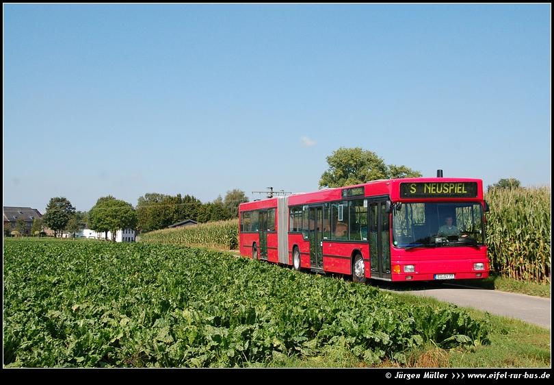 Seit Beginn des Schuljahres bedient auch die Firma Schneider&Bank aus Mechernich einige S-Wagen und Schulbusse in Jülich. Zum Einsatz kommt dabei in der Regel dieser MAN NG 312 mit der Zulassung EU-GY 77, der bei Hasselsweiler in der Gemeinde Titz inmitten grüner Felder fotografiert wurde. Hier setzt der purpurfarbene Gelenkbus einen besonderen farblichen Akzent [03.09.2011].