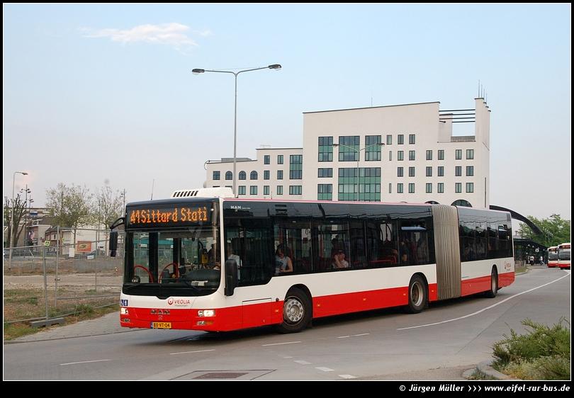 Blick über die Grenze in die benachbarten Niederlande: Veolia Wagen 6764 verlässt am 22.04.2011 die neu gebaute Haltestellenanlage an der Station in Heerlen. Insgesamt fünf dieser MAN Gelenkbusse sind überwiegend auf der Linie 41 zwischen Sittard, Heerlen und Kerkrade anzutreffen.