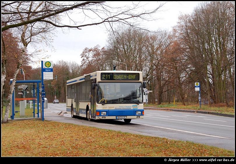 Fast zwei Jahrzehnte lang haben sie das Stadtbild Dürens geprägt; langsam verschwinden die letzten MAN NL 202 (A10) der Dürener Kreisbahn aus dem Fuhrpark. Im Rahmen einer Foto-Abschiedsfahrt wurde KOM 87 am 04.12.2011 fotogerecht an der Haltestelle "Weyerhof" positioniert. Nochmals herzlichen Dank an die DKB!