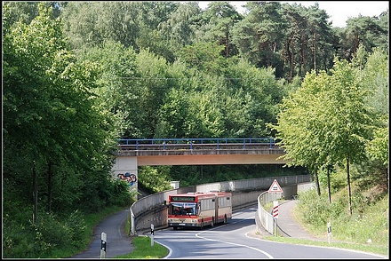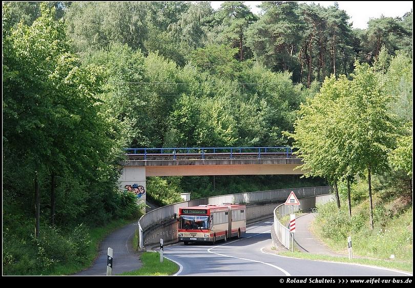 Anlässlich der Ausmusterung der verbliebenen drei MAN SG 312 der WestEnergie und Verkehr wurde mit Wagen 9622 eine kleine Abschiedsfahrt für Hobbyfreunde durchgeführt. Dabei wurden ausgiebige Fotomöglichkeiten realisiert, wie hier im Gewerbegebiet Wegberg-Wildenrath bei der Durchfahrt einer Eisenbahnbrücke (aufgenommen durch Roland Schulteis, 09.07.2011). Auch an die west ein herzliches Dankeschön für die freundliche Unterstützung!