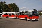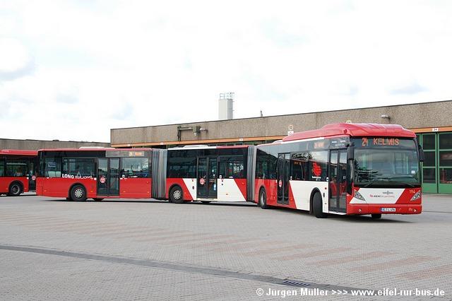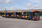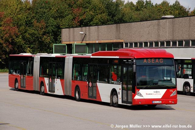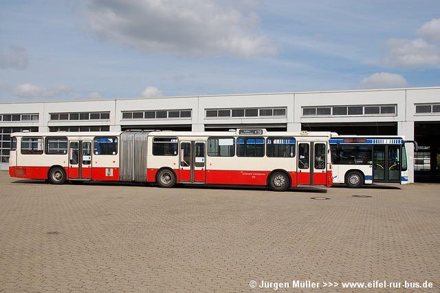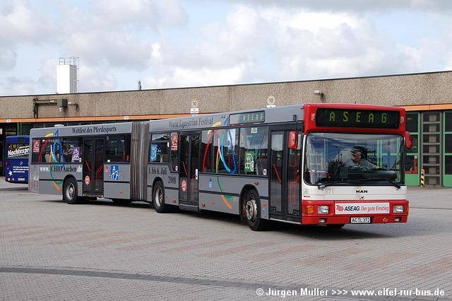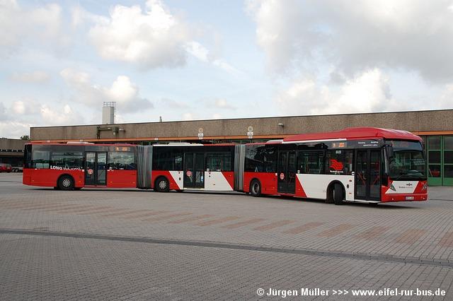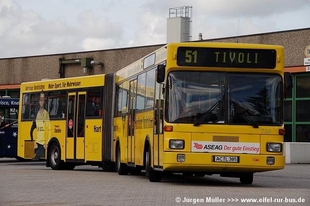 Anschließend erfolgte die Rückfahrt zum ASEAG-Zentralbetriebshof, wo nun nach und nach ausgewählte Fahrzeuge der ASEAG und RVE fotogerecht positioniert wurden. Neben der Typenvielfalt und interessanten Vollwerbungen konnte sicherlich einer der beiden Van Hool AGG 300 Doppelgelenkbusse der ASEAG (Nr. 194) als begehrtes Fotomotiv die Fotografen begeistern: |