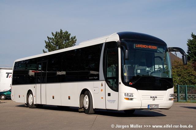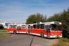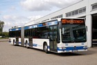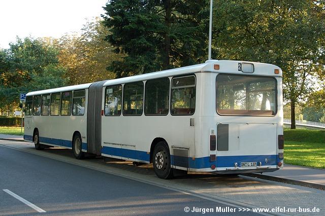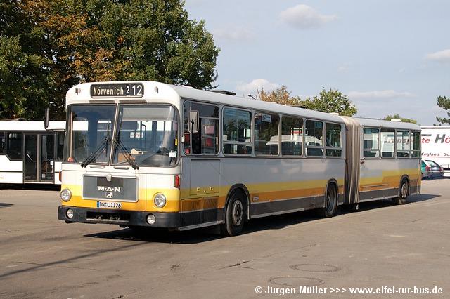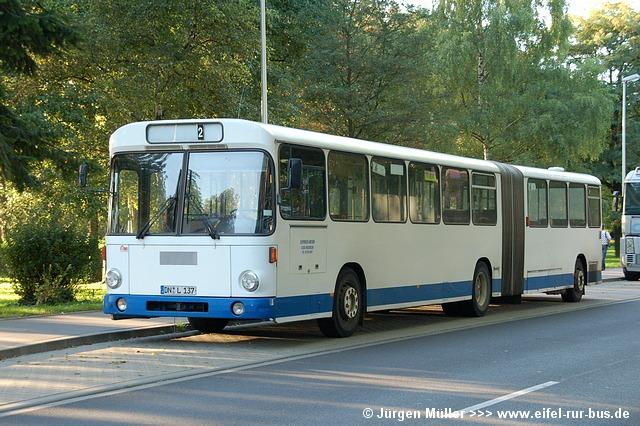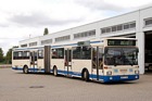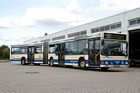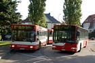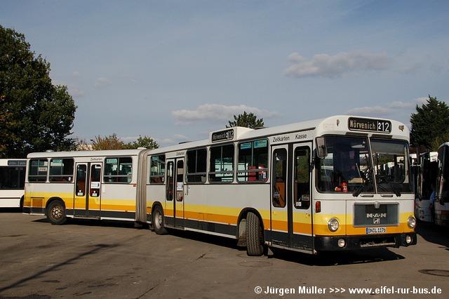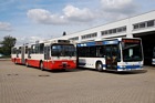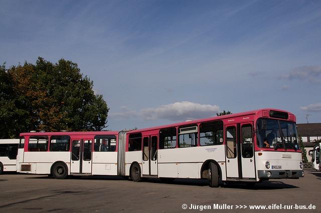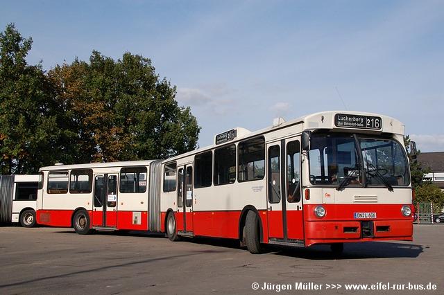 Am Nachmittag wurde der Betriebshof von Lövenich-Reisen in Niederzier besucht. Hier schlug wohl das Herz der Standard-I-Freunde höher, da hier noch mehrere Fahrzeuge dieser Generation vorzufinden waren und ebenfalls fürs Foto ins rechte Licht gerückt wurden. Auch der neueste MAN-Überlandbus vom Typ Lion´s Regio (ÜL 314) war an diesem Tag anwesend und wurde fotogerecht positioniert. Zum Abschluss wurde noch mit einem Mercedes-Benz O 305 G (DN-L 868, ex MVG Lüdenscheid 478) eine kleine Fahrt ans Ende des Gewerbegebiets "Rurbenden" unternommen, wo der Gelenkbus an einem kleinen Wendehammer vor grüner Hintergrundkulisse rangiert wurde: |