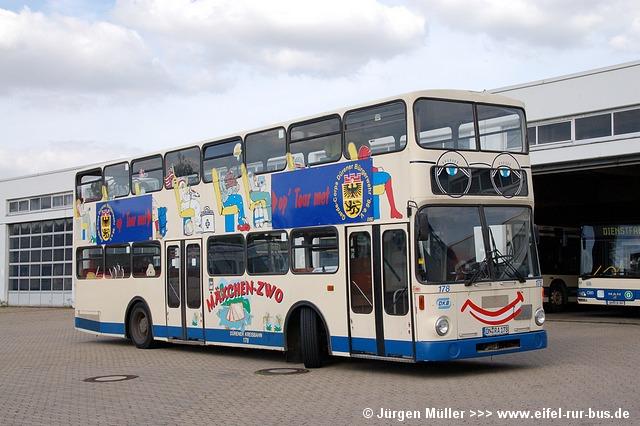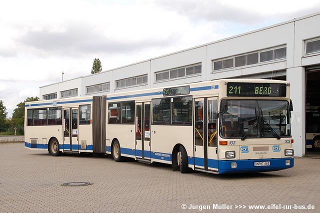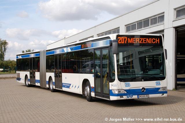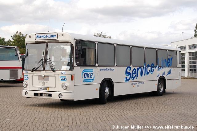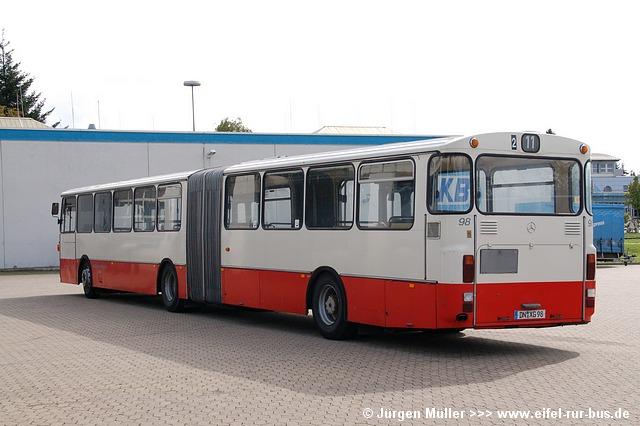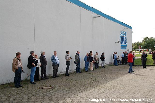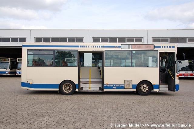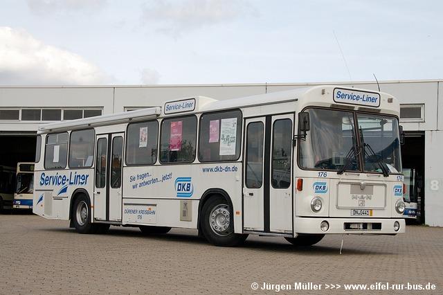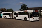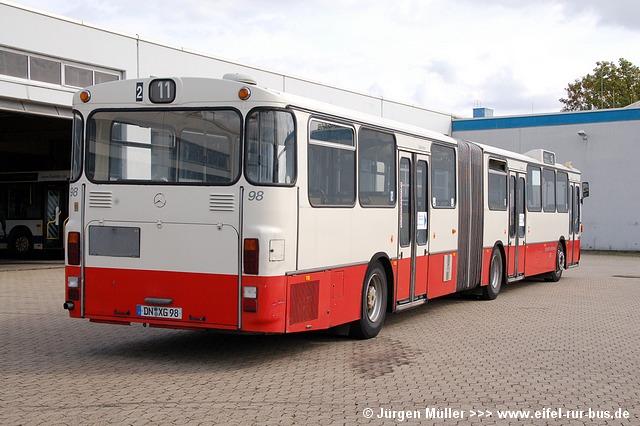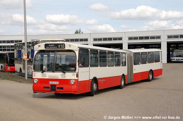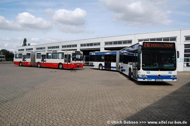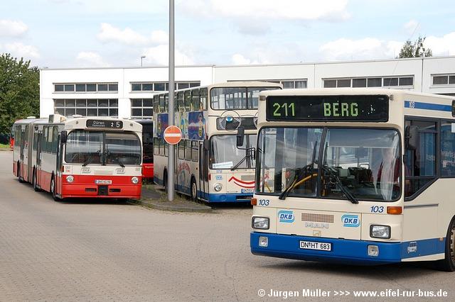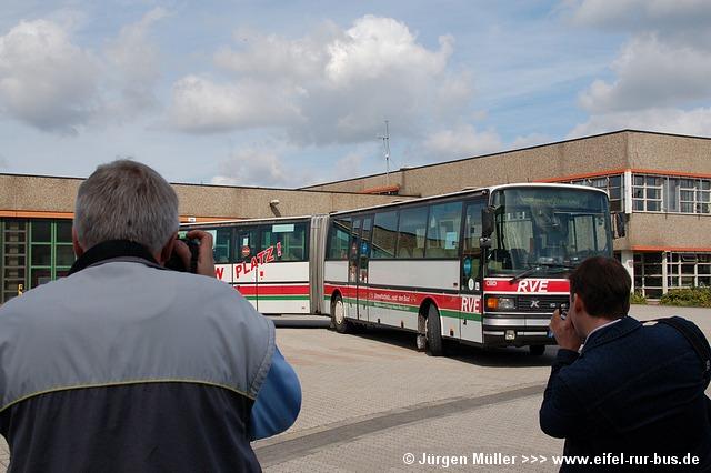Nachdem die ausgewählten Fahrzeuge der ASEAG und RVE ausgiebig abgelichtet wurden, ging es mit RVE-Wagen 3002, einem Setra SG 221 UL Gelenkbus, über die Autobahn nach Düren zunächst ins Gewerbegebiet "Im Großen Tal", wo die Mittags-pause verbracht wurde. Nach einer Stärkung führte der Weg zum DKB-Betriebshof in Düren-Distelrath, wo ebenfalls ein Querschnitt über den abwechslungsreichen Fuhrpark der DKB geboten wurde. Ob moderner Niederflurgelenkbus oder interessante Vollwerbung, auch hier gab es wieder eine breit gefächerte Auswahl. Ein besonderes Motiv aus mehreren Generationen von Mercedes-Benz bildeten die Wagen 98 und 155 nebeneinander Zum Abschluss wurde mit dem "Mäxchen zwo" der DKB eine kleine Runde über den Hof gedreht. |