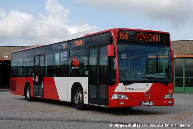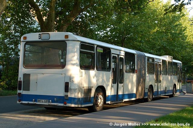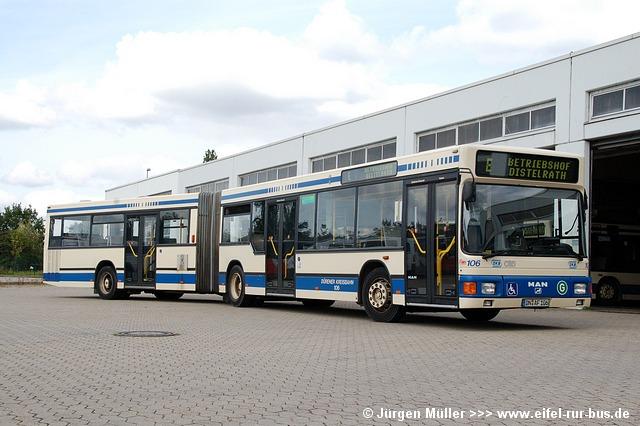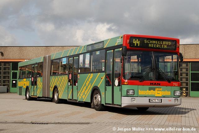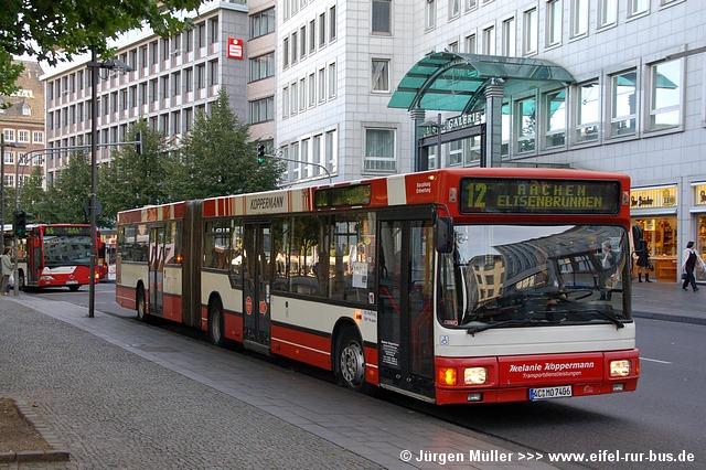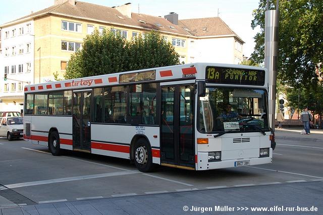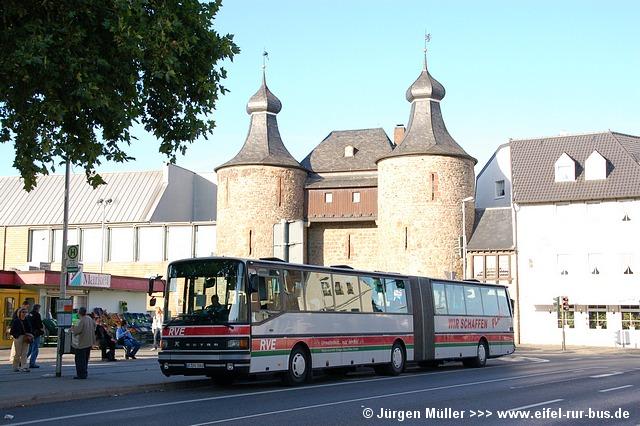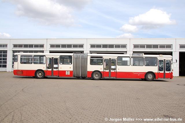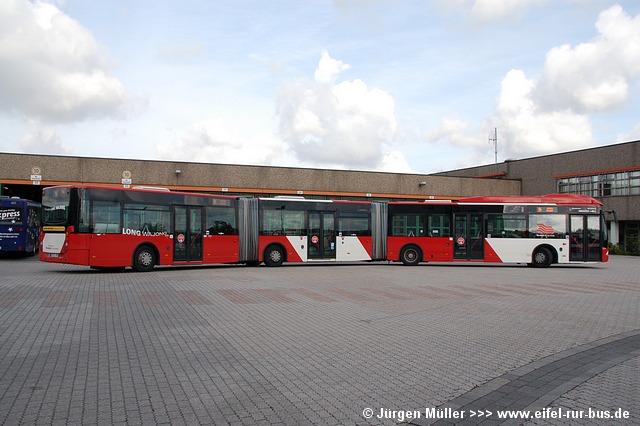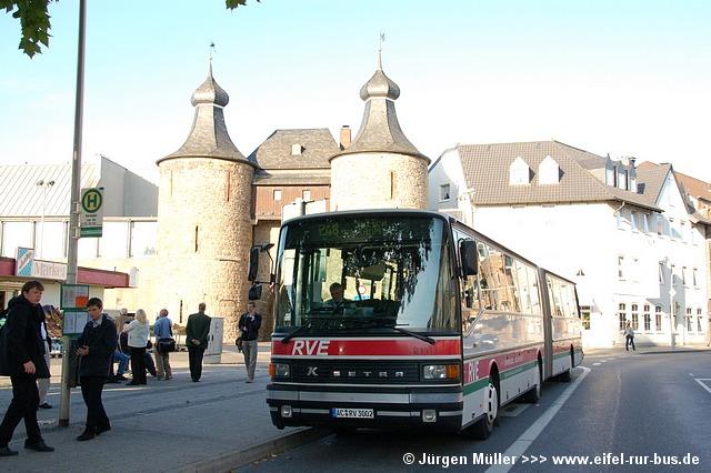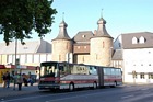 Die Rückfahrt erfolgte vom Lövenich-Betriebshof aus über Jülich, wo zunächst am Walramplatz vor Kulisse des Hexenturmes, einem Jülicher Wahrzeichen, ein Fotohalt eingelegt wurde. Anschließend wurde der Abstellplatz des DN-L 137 von Lövenich (MAN SG 240 H) angefahren, so dass an diesem Tag alle Standard-I-Fahrzeuge von Lövenich-Reisen fotografiert werden konnten. Nun ging die Fahrt weiter ins Gewerbegebiet Aldenhoven, wo ein letzter Fotohalt für eine Portraitaufnahme des RVE-Gelenkbusses eingelegt wurde. Von hier aus führte die Fahrt dann über die Autobahn nach Aachen zunächst zum Hauptbahnhof und wieder zum ASEAG-Zentralbetriebshof. |