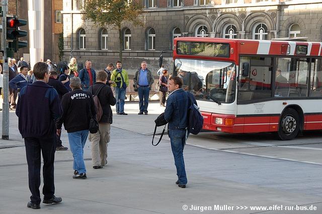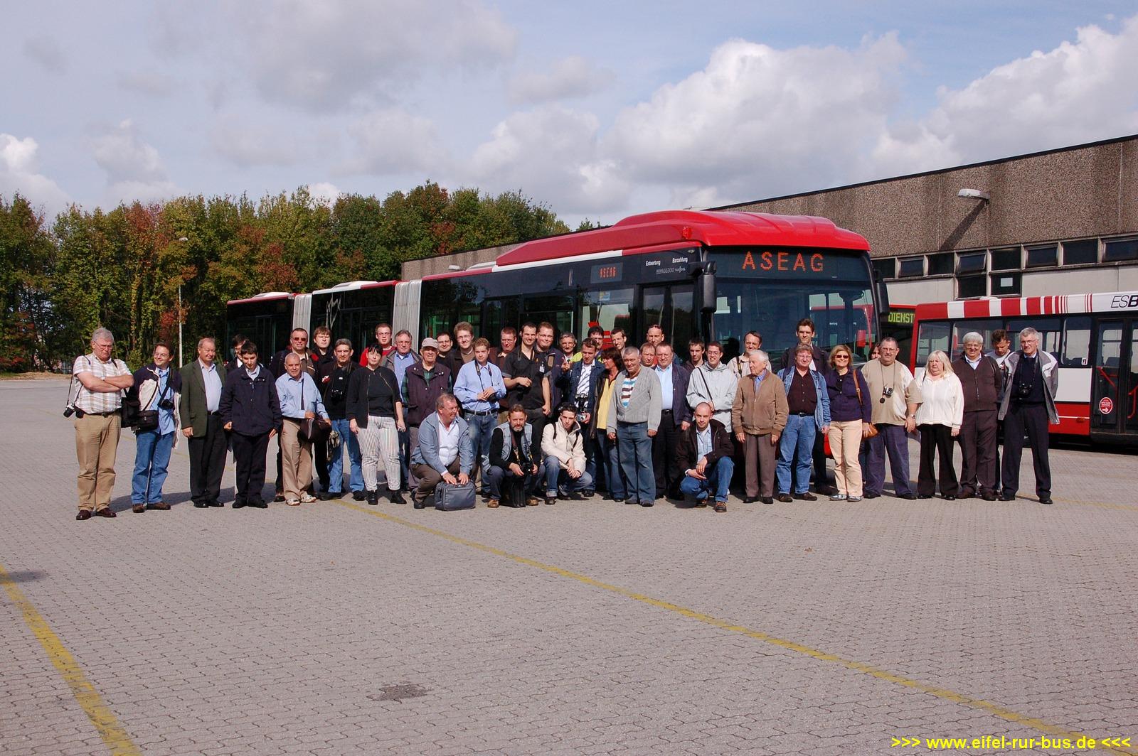Der erste Treffpunkt war auf dem ASEAG-Zentralbetriebshof, der gegen 9 Uhr mit dem Wagen AC-MO 7406 (MAN NG 272) der Firma Koppermann aus Stolberg verlassen wurde, um den zweiten Treffpunkt, Aachen Hauptbahnhof, anzusteuern. Nach einer Fahrt quer durch die Stadt mit Fotohalt am Elisenbrunnen füllte sich der ehemalige ASEAG-Gelenkbus (Nr. 789) am Hauptbahnhof vor allem durch belgische Fototfreunde, die eigens aus Lüttich und Eupen mit einem Bus der Firma SADAR angereist waren. Beide Fahrzeuge fuhren nun zu den Haltestellen Siegel und Waldfriedhof am Stadtrand, wo die ersten Fotomöglichkeiten für die gesamte Gruppe, bestehend aus 43 Fotografinnen und Fotografen aus Deutschland, Belgien und den Niederlanden, gegeben wurden.