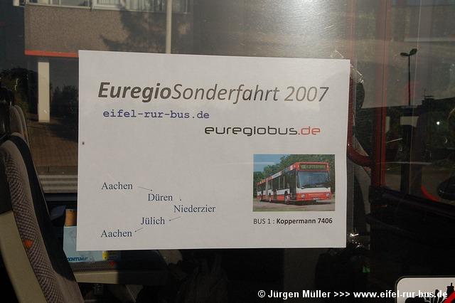 Am Samstag, den 15.09.2007 fand die erste Foto-Sonderfahrt im Euregio-Gebiet in den Regionen Aachen und Düren statt. Organisiert wurde diese Fahrt von Sascha Wassen (euregiobus.net), Roland Schulteis und Jürgen Müller (eifel-rur-bus.de). Diese Fotoserie soll ein paar Eindrücke des Tages, der aus Organisatorensicht sehr erfolgreich verlaufen ist, wiedergeben.
