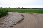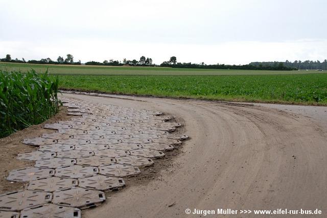 Für die Rückfahrt über den Feldweg zum Nebentor wurde die Kurve vor der Einfahrt durch spezielle Platten verstärkt... |