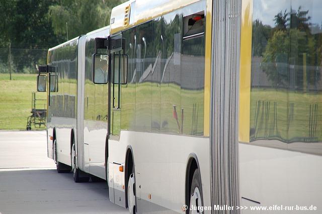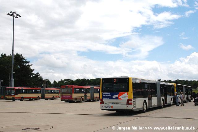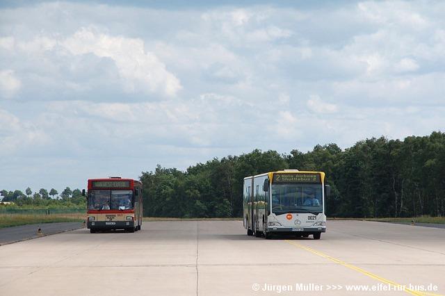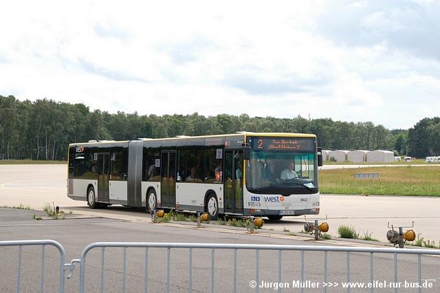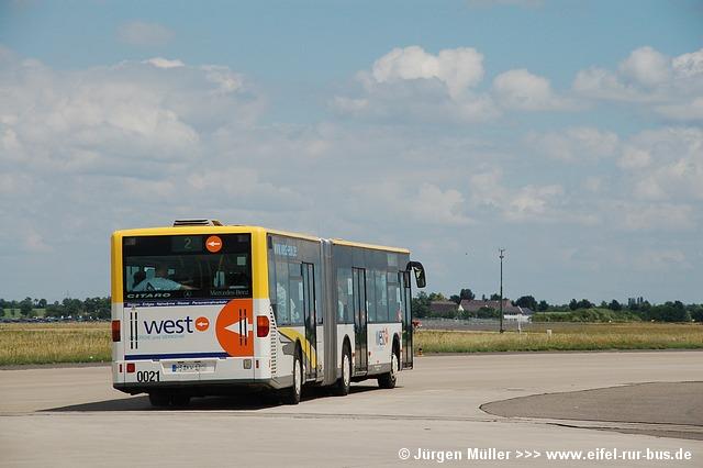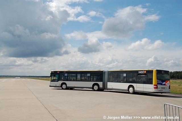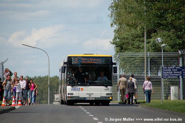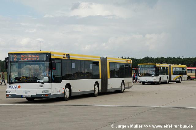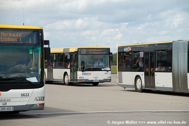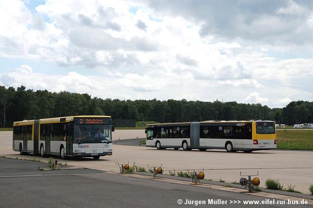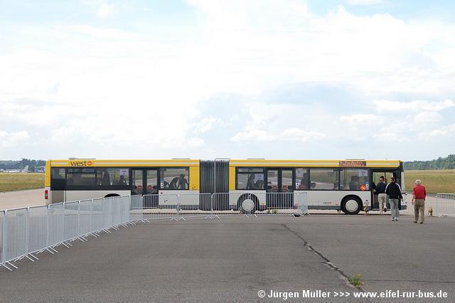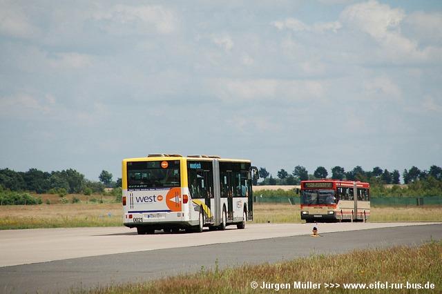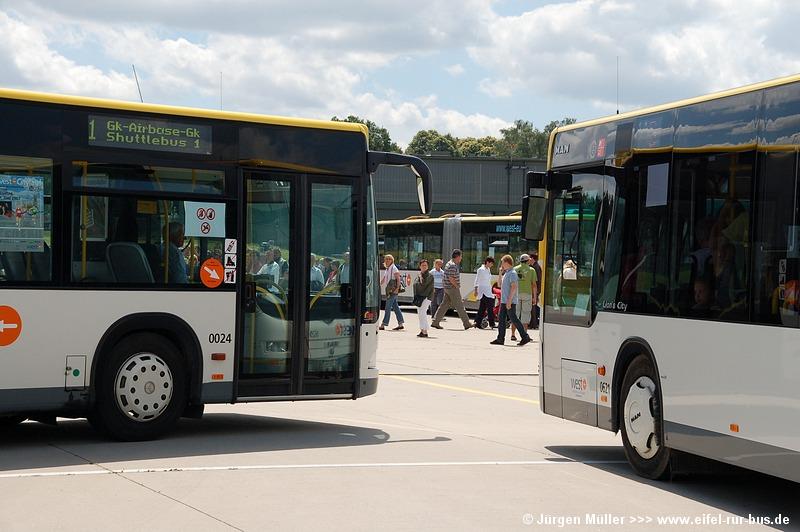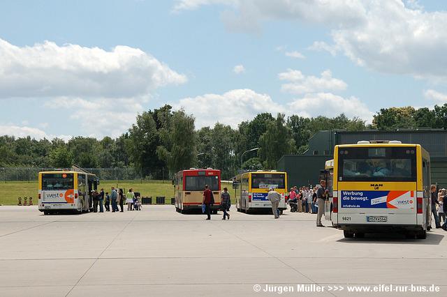 Die folgenden Fotos entstanden ebenfalls im Rahmen der Jubiläumsfeier und zeigen neben "Gruppenaufnahmen" der Shuttlebusse weitere Fahrzeuge, die beispielsweise anlässlich Sonderfahrten zur Airbase fuhren. So konnten unter anderem je ein Bus von Knoben Reisen aus Heinsberg und von Taeter Aachen beobachtet werden. Der Wagen 0003 der west kam am Sonntag gegen Mittag an und wurde kurzerhand gegen den Reservebus 9123 getauscht.