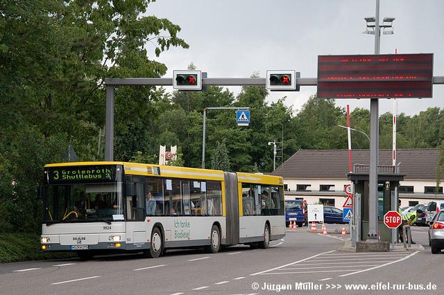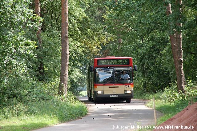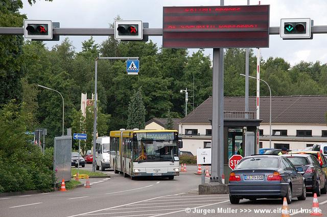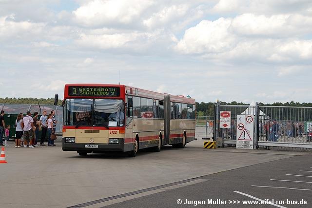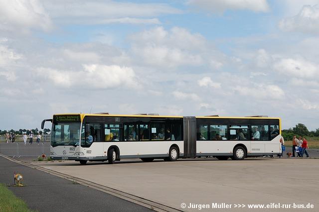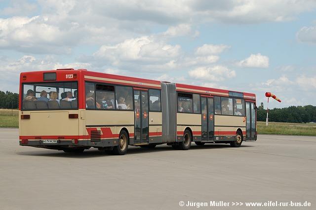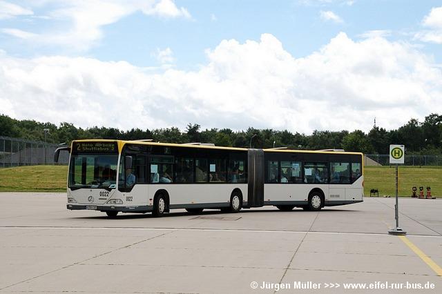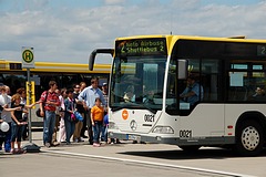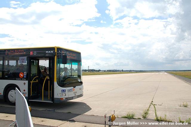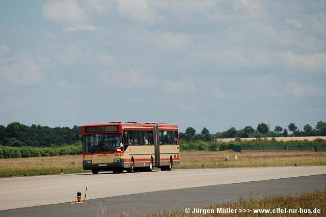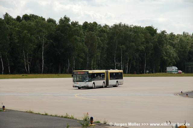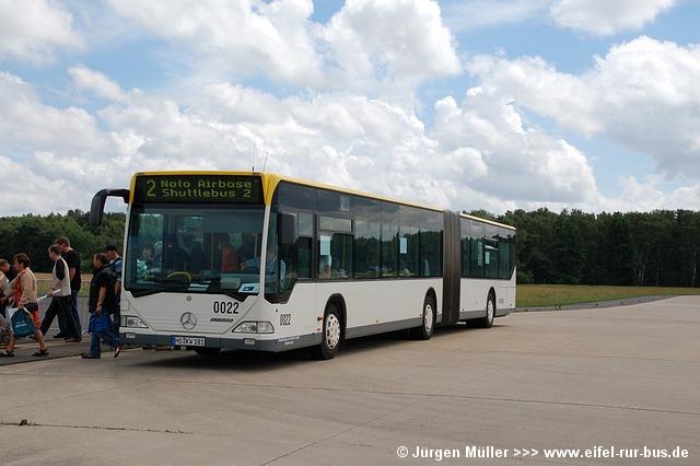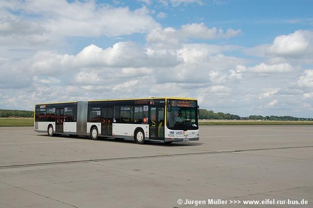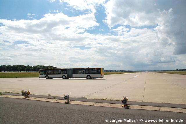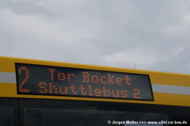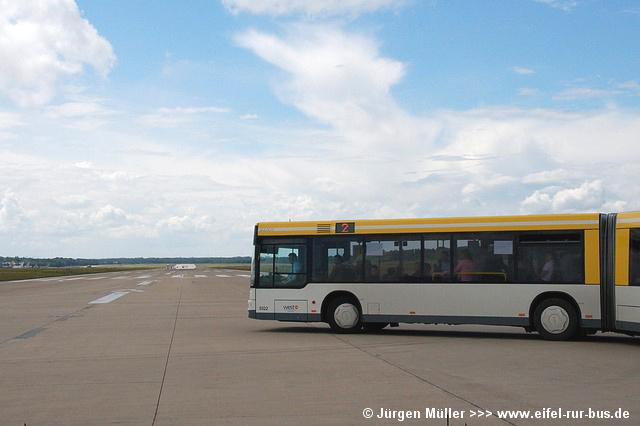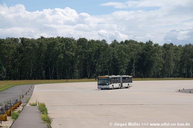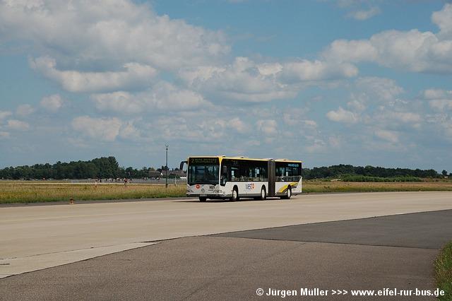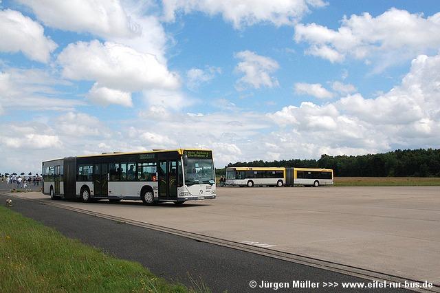 Den kürzesten Linienweg fuhren die Busse auf der Route 2 von der Haltestellenanlage am Veranstaltungsgelände ohne Zwischenhalt über das Rollfeld bis auf das Ende der großen Hauptstartbahn. Von hier aus konnte man zu Fuß weiter zu den Großparkplätzen auf Wiesen und Feldern im Bereich der Ortschaften Bocket und Panneschopp gelangen. Obwohl die Fahrzeuge nur innerhalb der Airbase über das Rollfeld verkehrten und die Fahrt weniger als eine Minute dauerte, war der Streckenverlauf für Fotozwecke besonders interessant. In der Regel fuhren auf der Route 2 zwei Fahrzeuge, bei hohem Andrang teilweise kurzzeitig auch drei. Auffällig war, dass bis auf den zusätzlichen Reservewagen 9123 ausschließlich Niederflurfahrzeuge eingesetzt wurden.