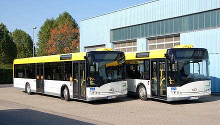 Der Fuhrpark der WestEnergie und Verkehr erhielt im Jahr 2010 erstmals Zuwachs durch Fahrzeuge eines weiteren Herstellers. Während die Busse zuvor bei NEOMAN und EvoBus beschafft wurden, gelangten im Herbst zwei Solo- und zwei Gelenkfahrzeuge des polnischen Herstellers Solaris als erste Fahrzeuge ihres Typs im Kreis Heinsberg zur west. Zur Erprobung neuer Technologien wurden die Busse mit unterschiedlichen Getrieben ausgestattet, um Erfahrungswerte für künftige Bestellungen zu sammeln. Dabei erhielten je ein Solo- und ein Gelenkfahrzeug ein ZF-Getriebe, während die anderen beiden Fahrzeuge mit Voith-Getrieben ausgerüstet wurden. Im Rahmen der gemeinschaftlichen Ausschreibung gelangten weitere Solaris-Fahrzeuge auch an die Verkehrsbetriebe in Neuss (SWN) und Mönchengladbach (NVV). |