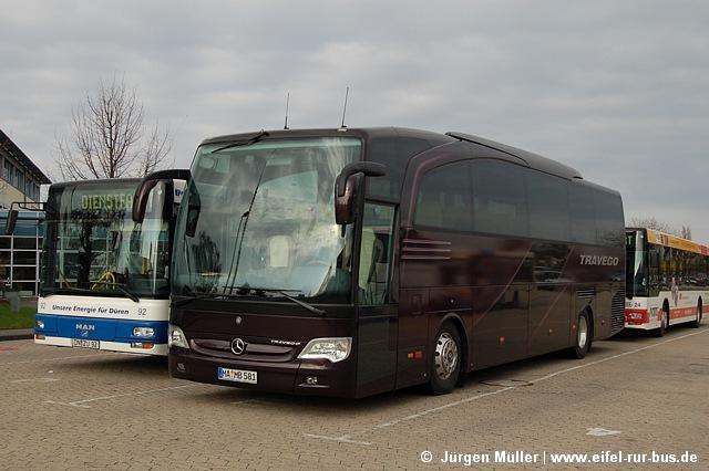 Für einige Tage hat die Dürener Kreisbahn einen Mercedes-Benz Travego mit dem Kennzeichen MA-MB 581 zu Vorführzwecken zur Verfügung. Die Fotos zeigen den Reisebus der neuesten Generation auf dem Betriebshof Distelrath.
