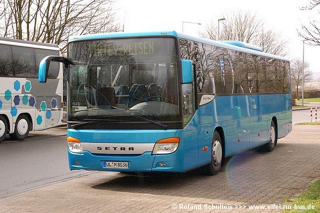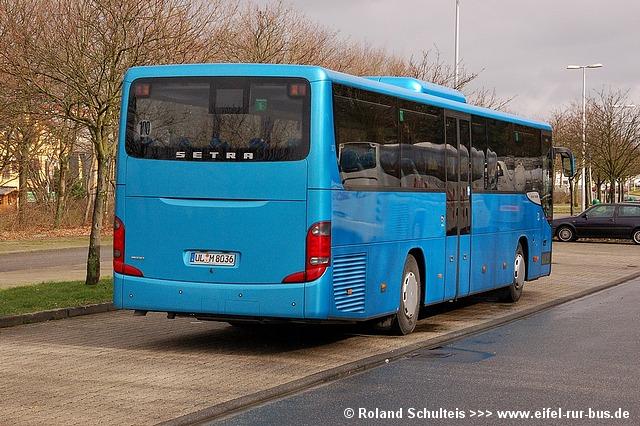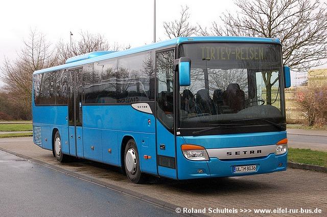 Für einige Wochen konnte bei Tirtey, Titz ein Vorführwagen der neuesten Setra-Generation beobachtet werden. Der blaue S 415 UL mit dem Kennzeichen UL-M 8036 kam überwiegend auf der Tirtey-Linie 922 im Raum Bergheim zum Einsatz und wurde von Roland Schulteis in Aachen-Hüls fotografiert: