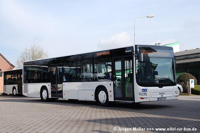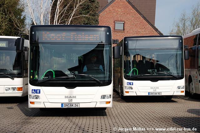 Zum Monatsende hat Koof Reisen in Linnich zwei MAN Fahrzeuge des Typs Lion´s City in Betrieb genommen. Die beiden weißen Busse erhielten die Kennzeichen DN-AK 24 und DN-AK 90 und sind die ersten Fahrzeuge dieses Typs im Kreis Düren. Ausgemustert wurden DN-AK 461 (S 315 UL) und DN-AK 586 (MAN EL 202).