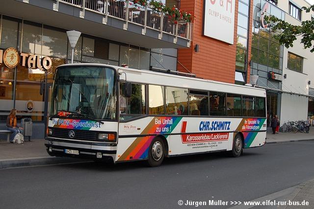 Der Mercedes-Benz O 405 stammt ursprünglich von den Stadtwerken Lübeck (Wagen 615) und war bis 2004 beim Omnibusunternehmen Schilling in Hürth als K-VK 1026 im Einsatz. Die Fotos von Jürgen Müller und Uwe Weixelbaum zeigen den Bus zu Schilling-Zeiten sowie aktuell im Einsatz auf der RVE-Linie SB 98 in Vettweiß-Froitzheim.