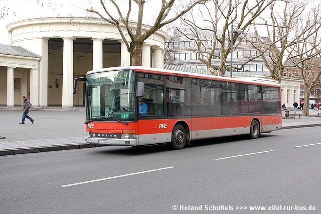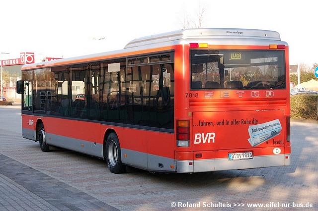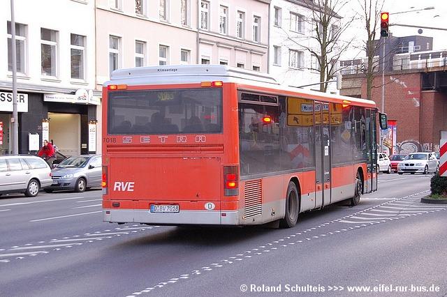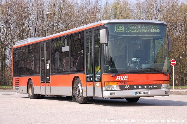 Nach Eintreffen der Neufahrzeuge beim Busverkehr Rheinland wurden 6 Fahrzeuge vom Typ Setra S 315 NF kurzzeitig an die Schwestergesellschaft BVO in Bielefeld abgegeben, um Fahrzeugengpässe bis zum dortigen Eintreffen der Neufahrzeuge zu überbrücken. Inzwischen sind alle Fahrzeuge wieder bei der BVR in Düsseldorf eingetroffen. Die zwei S 315 NF in Schnellbus-Lackierung (D-BV 8107 und D-BV 8108) werden in Kürze zur Tochtergesellschaft RVN nach Wesel gelangen und dort die Fahrzeuge WES-RV 343 (S 215 UL) und WES-DB 606 (S 215 NR, ex RVE 4004) ersetzen. Einer der S 315 NF in Farbgebung des StadtBus Dormagen (D-BV 7018) ist bereits nach Aachen zur RVE überführt worden und ersetzt künftig als AC-RV 7018 den kürzlich ausgemusterten AC-RV 5004 (Mercedes-Benz O 408). Roland Schulteis fotografierte den Bus auf dem ASEAG-Betriebshof vor der Umzeichnung auf RVE und wenige Tage später im RVE-Einsatz.