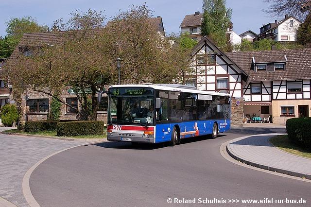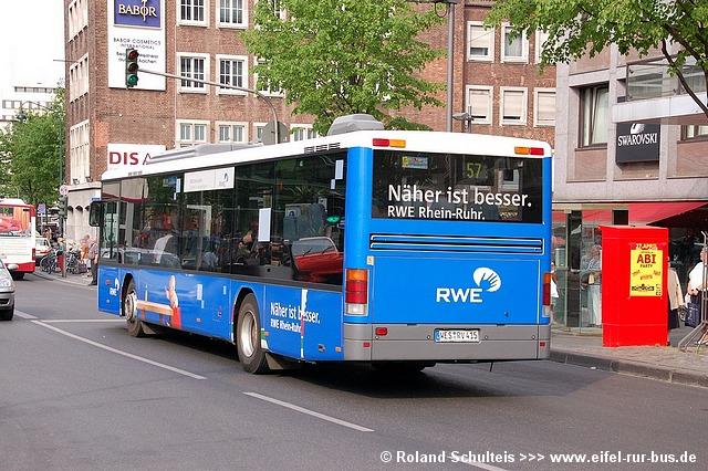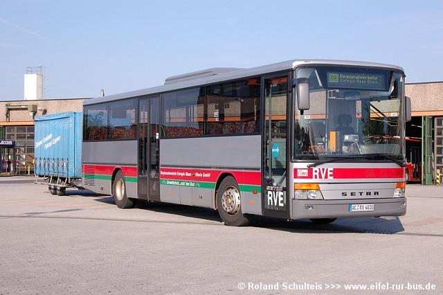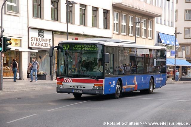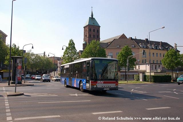 Aufgrund von Fahrzeugengpässen bei der RVE verweilte für die Dauer von knapp zwei Wochen der Setra S 315 NF mit dem Kennzeichen WES-RV 415 der Schwestergesellschaft RVN bei der RVE in Aachen. Die Fotos von Roland Schulteis zeigen den RVN-Bus im Einsatz in Aachen und Einruhr.