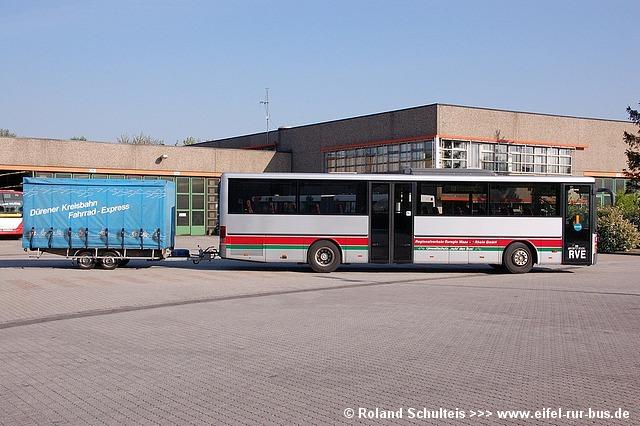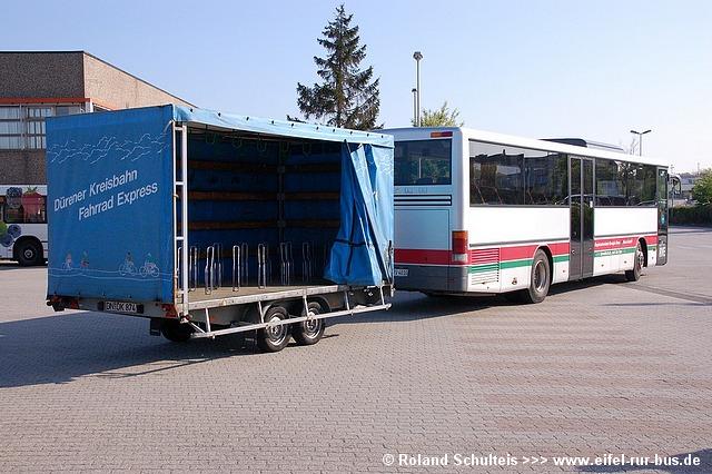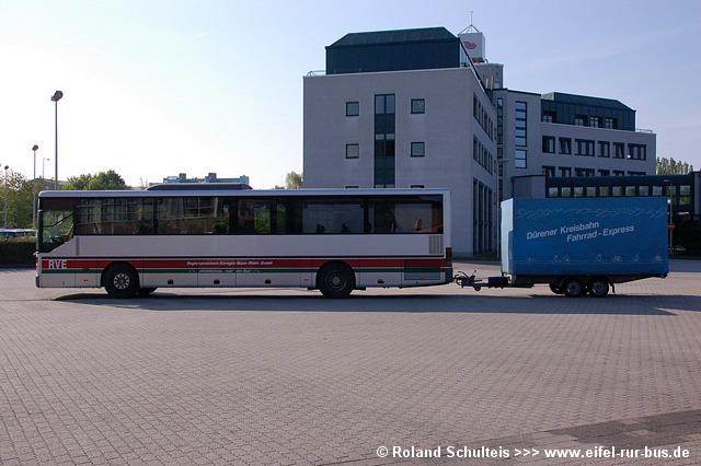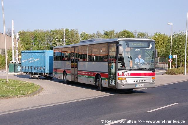 Da der Fahrradbus-Testbetrieb zwischen Aachen und Einruhr / Burg Vogelsang (Eifel) im vergangenen Sommer positiv verlaufen ist, wird der Bus neben zwei Terminen im Mai an allen Sonntagen in der diesjährigen Saison (Juni bis Oktober) planmäßig verkehren. Allerdings wird dieser dann nicht mehr durch einen Sprinter mit Fahrradanhänger begleitet, sondern den Anhänger selber ziehen. Hierzu wurde an dem Wagen 4010 (Setra S 315 UL) eine Anhängerkupplung montiert. Da sich bei dem neubeschafften Anhänger die Auslieferung verzögert, wurde ersatzweise auf den Fahrradanhänger der Dürener Kreisbahn zurückgegriffen. Am 23.04.2007 wurde das Gespann der Presse vorgestellt.