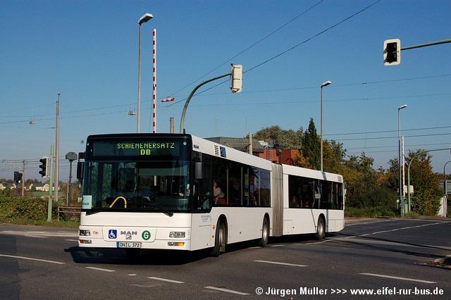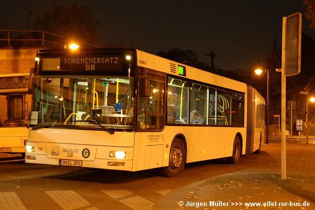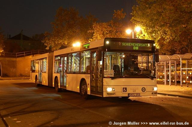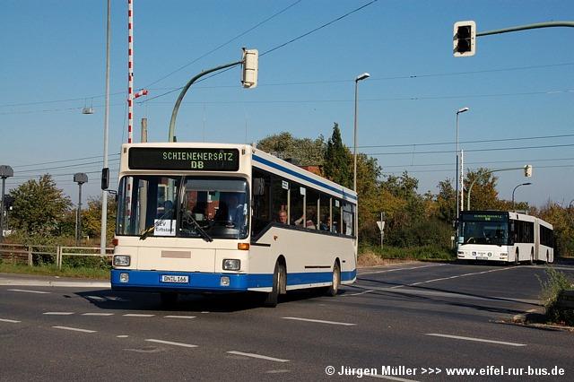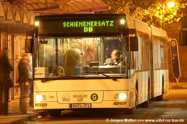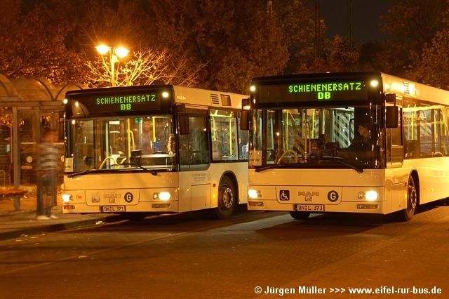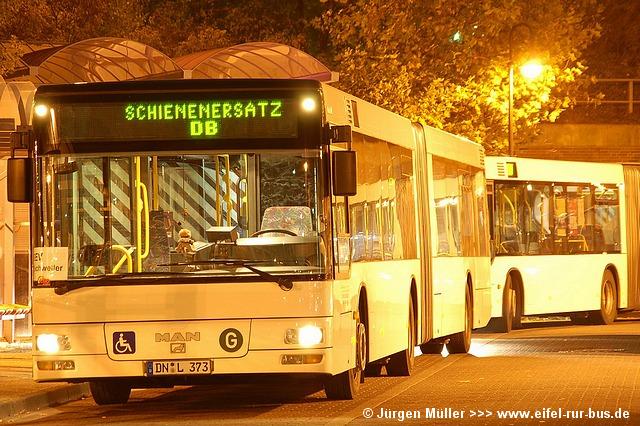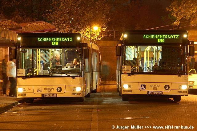 In der Nacht von Samstag, den 27.10.2007 auf Sonntag, den 28.10.2007 fand ein baustellenbedingter Schienenersatzverkehr zwischen den Bahnhöfen Düren und Eschweiler mit Zwischenhalt in Langerwehe und teilweise Nothberg statt. Zum Einsatz kamen drei Solo- und vier Gelenkbusse von Lövenich-Reisen aus Niederzier im RVE-Auftrag für die Deutsche Bahn AG. Die Fotos zeigen die zur Abfahrt bereitgestellten Busse am Dürener Hauptbahnhof: