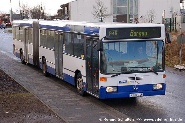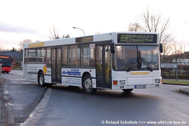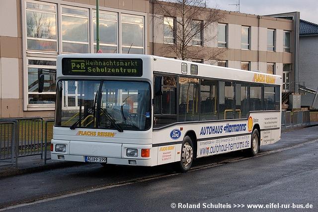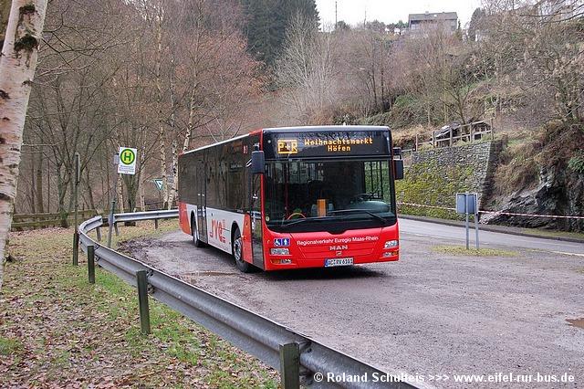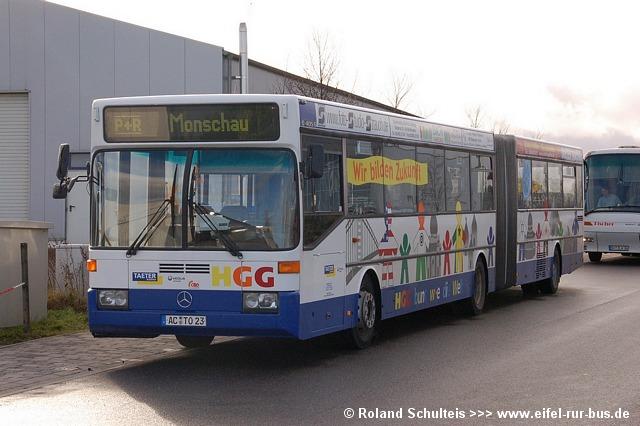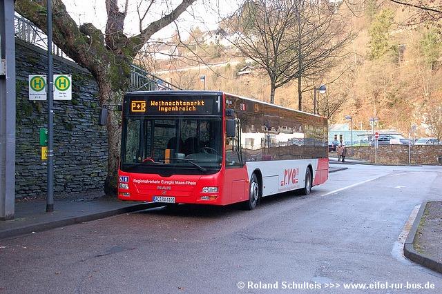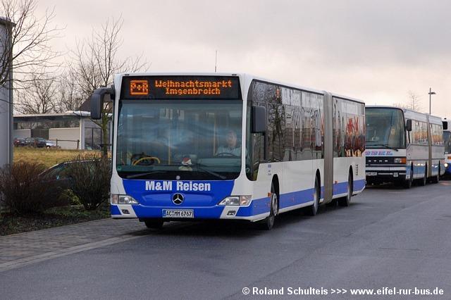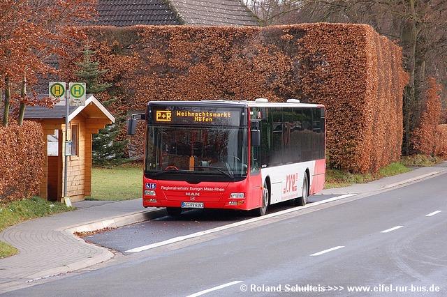 Zum diesjährigen Weihnachtsmarkt im Eifelstädtchen Monschau werden wieder zahlreiche Pendelbusse eingesetzt, um die mit Reisebussen angereisten Besucher von den außerhalb gelegenen Parkplätzen ins Stadtzentrum zu befördern. In diesem Jahr wurde eine neue Route zwischen Monschau Gymnasium und Parkhaus eingerichtet, so dass inzwischen vier Pendelbusstrecken zum Weihnachstmarkt verkehren. Zum Einsatz kommen auf der Hauptachse nach Imgenbroich überwiegend Gelenkbusse von Privatunternehmen (Taeter-Aachen, Eifelgold, M&M, Rüssel) und auf den anderen beiden Strecken Solo-Fahrzeuge der Eifeler Unternehmen Lehner und Flachs-Reisen.