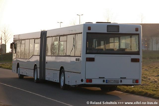 In den vergangenen Wochen wurden bei Tirtey-Reisen in Titz zwei Fahrzeuge gebraucht beschafft. Hierbei handelt es sich um einen Mercedes-Benz O 405 N, der das Kennzeichen DN-T 5855 erhielt, sowie einen Mercedes-Benz O 405 GN, der nun unter DN-T 8500 zugelassen wurde. Das Gelenkfahrzeug stammt ursprünglich von der Hagener Straßenbahn AG (Wagen 903). Ausgemustert wurde im Gegenzug der Mercedes-Benz O 405 N mit dem Kennzeichen DN-T 389. Die Fotos von Roland Schulteis zeigen die Fahrzeuge in neuer weißer Lackierung sowie den ausgemusterten DN-T 389; auf dem Foto von Sascha Wellert erkennt man den Gelenkbus noch mit Vollwerbung im Hagener Linieneinsatz: