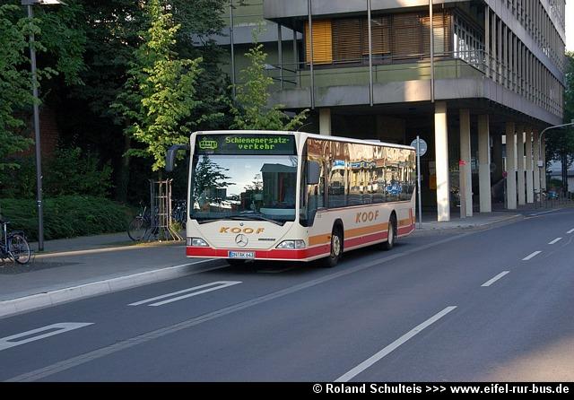 Am Samstag, den 16.08.2008 fand auf der Euregiobahn-Strecke zwischen Aachen Hbf. und Stolberg-Altstadt ein Schienenersatzverkehr statt. Dieser wurde von Koof Reisen aus Linnich im Auftrag der RVE durchgeführt. Die Fotos von Roland Schulteis zeigen zwei Koof Busse am Aachener Hauptbahnhof: