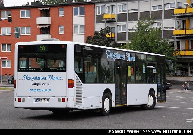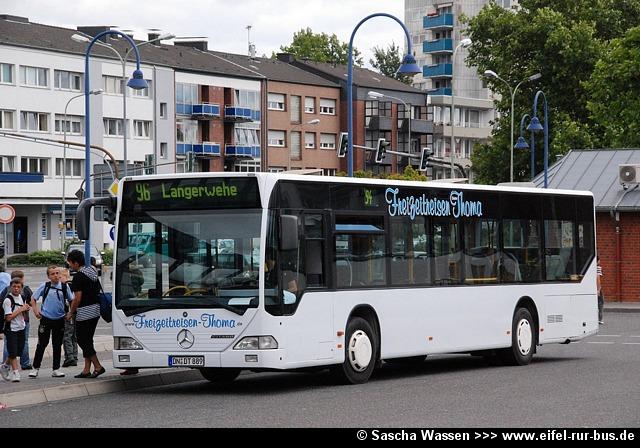 Kürzlich wurden bei Thoma Reisen in Langerwehe zwei Fahrzeuge gebraucht beschafft. Dabei handelt es sich um einen Neoplan N 4016 NF und einen und EvoBus Citaro, die auf DN-DT 102 und DN-DT 889 zugelassen wurden und somit die bisherigen Fahrzeuge mit diesen Kennzeichen (Mercedes-Benz O 303-15 KHP und MAN SL 202) ersetzen. Die Fotos von Sascha Wassen zeigen den bisherigen und aktuellen DN-DT 889; das Foto von Daniel Potthoff zeigt den übernommenen Citaro noch im Einsatz bei der Firma Martin Becker in Altenkirchen (AK-MB 117):