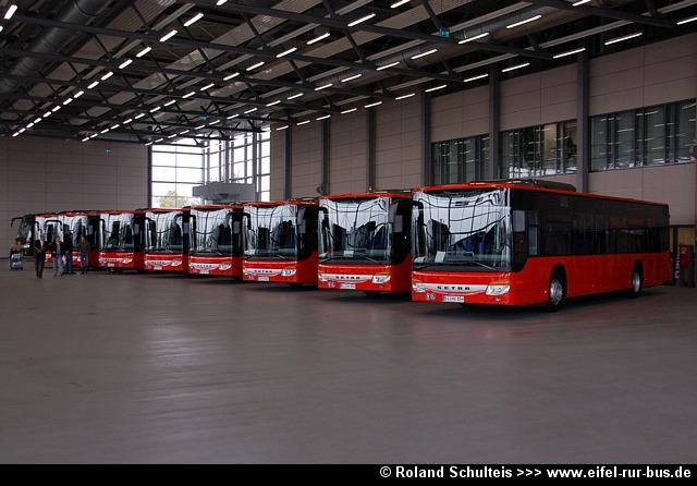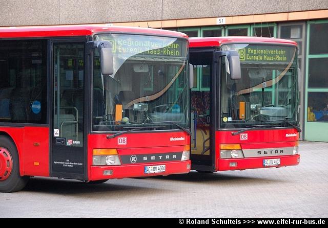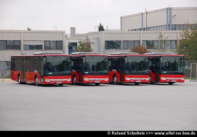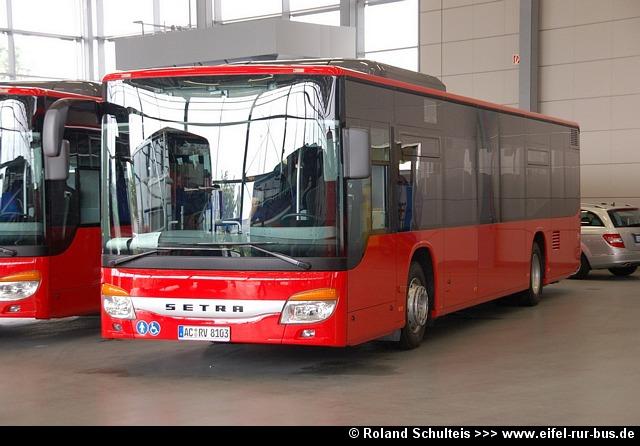 Im Rahmen der diesjährigen Fahrzeugneubeschaffung wurden bei der RVE drei Busse vom Typ EvoBus S 415 NF in Dienst gestellt und unter AC-RV 8101 bis 8103 in den Fuhrpark eingereiht. Die Fotos von Roland Schulteis zeigen die Wagen 8102 und 8103 neben weiteren Neufahrzeugen der DB Stadtverkehr bei der Abholung im Setra-Werk Ulm sowie kurze Zeit später im Linieneinsatz: