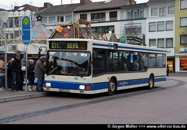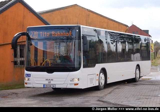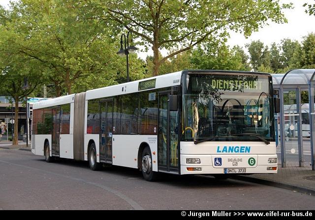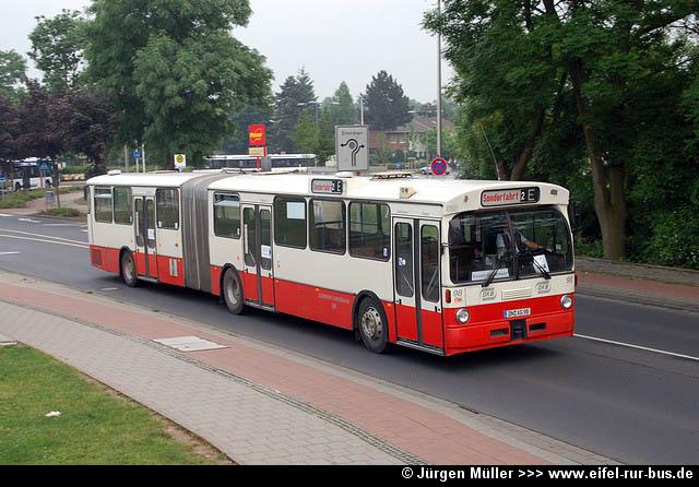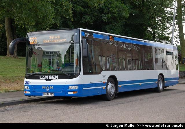 Bereits seit einigen Wochen kann bei Langen Reisen in Jülich der Einsatz des ehemaligen RVK-Wagens 106 (MAN SG 312) beobachtet werden. Der Bus mit dem Kennzeichen DN-TL 141 fährt im RVE-Auftrag in Jülich und Düren: