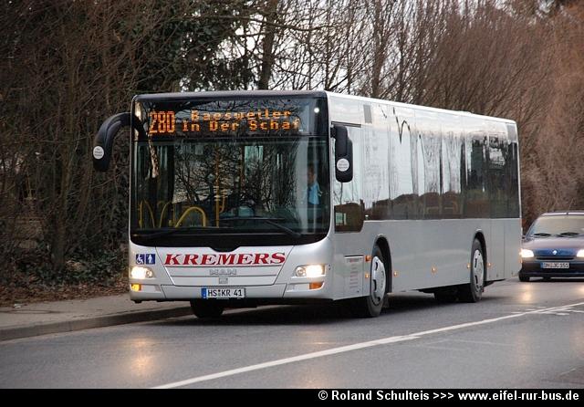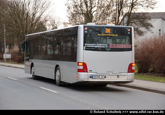 Bei Kremers Reisen in Wassenberg wurde abweichend zu den letzten zahlreichen Neubeschaffungen vom Typ EvoBus Citaro erstmals ein MAN Lion´s City (NL 273) in den Fuhrpark eingereiht. Der Bus mit dem Kennzeichen HS-KR 41 ist für den RVE-Auftragsverkehr vorgesehen:
