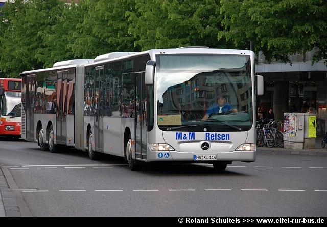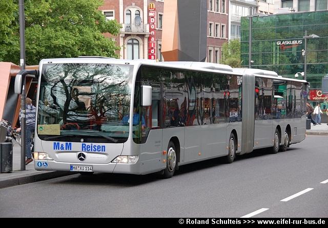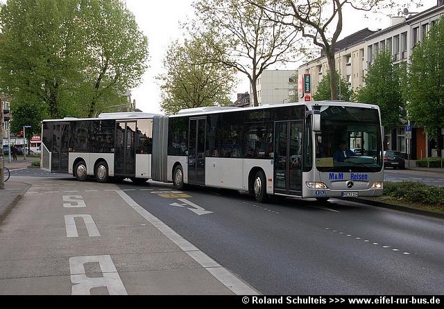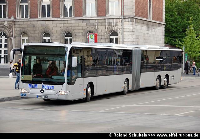 Für einige Tage konnte bei M&M-Reisen in Simmerath der Einsatz eines EvoBus CapaCity beobachtet werden. Die Fotos von Roland Schulteis zeigen den Werkswagen mit dem Kennzeichen MA-XI 114 am 03.04.2009 in Aachen: