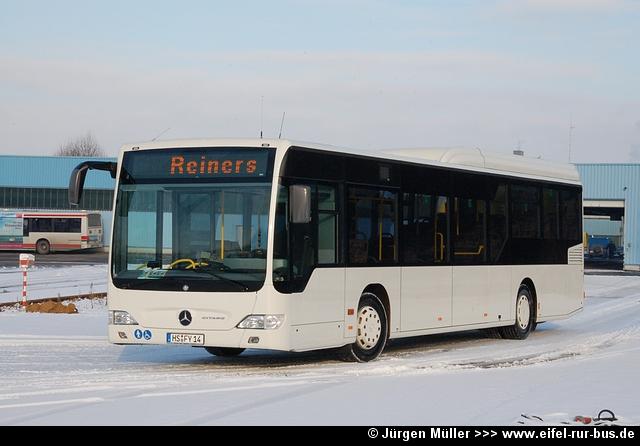 Das Gangelter Unternehmen Reiners Reisen hat als erstes Unternehmen im Kreis Heinsberg ein Neufahrzeug vom Typ EvoBus O 530 LE in Dienst gestellt. Das Low-Entry-Fahrzeug erhielt die Zulassung HS-FY 14 und ersetzt den Setra S 315 UL mit der bisherigen Zulassung HS-FY 14. Die Fotos zeigen den Neuzugang noch ohne Kennzeichen am 20.12.2009 auf dem Betriebshof der west in Geilenkirchen: