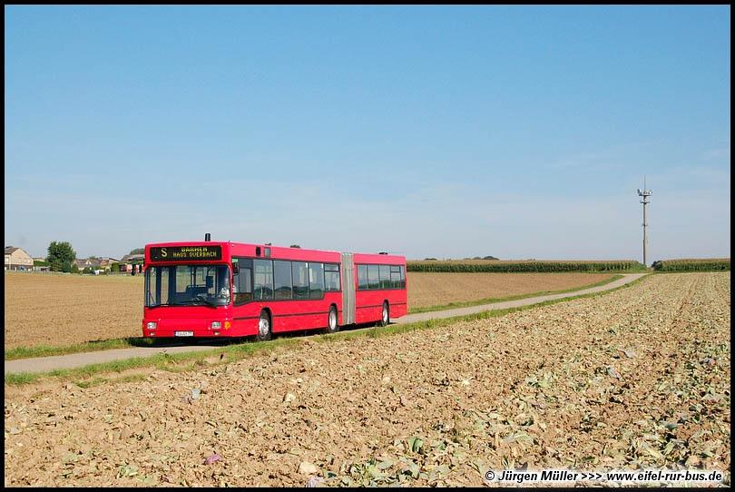 Von ursprünglich 21 Fahrzeugen der MAN Baureihe A10 befinden sich mittlerweile nur noch wenige Exemplare im Fuhrpark der Dürener Kreisbahn, die nach und nach durch Neufahrzeuge ersetzt werden. Auch der hier gezeigte KOM 84 hat mittlerweile ein neues Einsatzgebiet bei einem Privatunternehmen in der Region gefunden. Zum Zeitpunkt der Aufnahme befand sich der Bus allerdings noch unter "DKB-Flagge" im Einsatz auf der Schülerlinie 217 in der Gemeinde Merzenich... [Update: 27.11.2011]