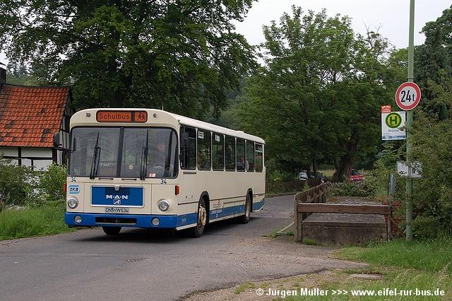 Weitestgehend im Originalzustand und immer noch im täglichen Schulbus-Einsatz befinden sich die ehemaligen Wagen 34 und 37 der Dürener Kreisbahn heute bei der Firma Berendes in Vettweiß. Am 01.06.2007 überquerte einer der beiden gut erhaltenen MAN SL 200 (Wagen 34) gerade den Neffelbach an der Haltestelle "Brücke" in Müddersheim... [03.06.2007] |