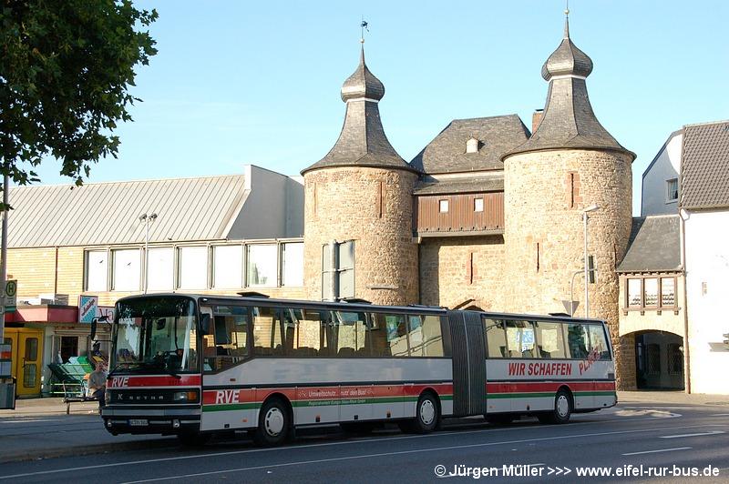 Während eines Fotohaltes im Rahmen der 1.EUREGIO-Fotosonderfahrt konnte in Jülich an der Haltestelle Walramplatz vor Kulisse des Hexenturmes dieses Foto des RVE-Wagen 3002 bei Nachmittagssonne entstehen. Der hier gezeigte Setra SG 221 UL Überlandgelenkbus ist eines von zwei Fahrzeugen dieses Typs bei der RVE... [23.09.2007]