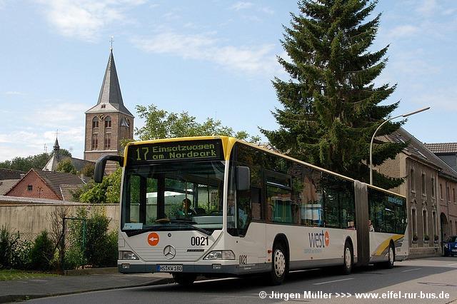Zu Heimspielen der Borussia Mönchengladbach setzen die Niederrheinischen Verkehrs- und Versorgungs-betriebe (NVV) auf der Linie 017 zwischen Wegberg und dem Stadion am Nordpark zusätzliche Busse ein. Auch die west bedient zwei Gelenkbuskurse im Auftrag der NVV. Wagen 0021 konnte im Rahmen eines solchen Einsatzes an der Haltestelle "Am Friedhof" in Wegberg-Beeck aufgenommen werden... [26.08.2007]
