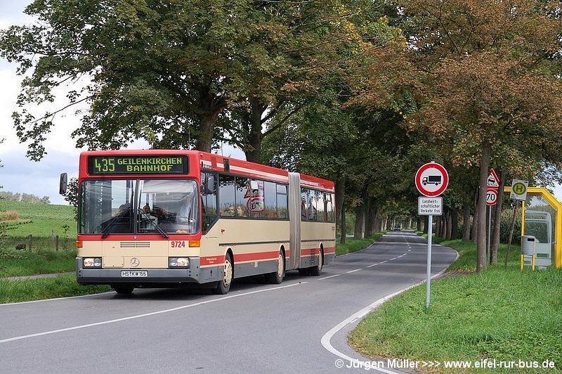 Auf den Selfkantlinien der WestEnergie und Verkehr GmbH bieten sich dem Fotografen aufgrund der geringen Fahrtenzahl zwar nur begrenzte Möglichkeiten, dafür aber umso mehr reizvolle Motive in landschaftlich geprägter Region zwischen Gangelt und dem Selfkant. Auf dem Foto erreicht Wagen 9724 der west im Einsatz auf der Linie 435 gerade von Birgden durch eine Allee kommend die B56 am Ortseingang von Gangelt-Stahe... [09.09.2007]