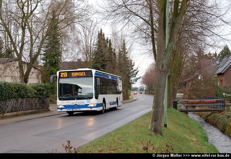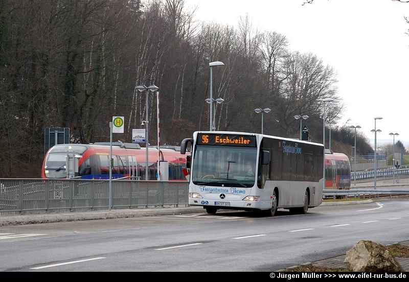 Mit Verlängerung der euregiobahn-Strecke über Weisweiler hinaus bis Langerwehe und Düren wurde auch die seit Jahren nur provisorisch vorhandene Haltestellenanlage für die Buslinien 96 und 294 der RVE (DB RheinlandBus) ausgebaut. Auf dem Foto steht mit DN-DT 323 einer von zwei Neuzugängen der Firma Thoma abfahrtbereit nach Eschweiler... [Update 20.02.2010]